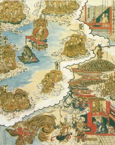Bouddha Amida dans le Paradis de lOuest, entouré dauditeurs attentif a son enseignement. Rouleau peint du XVIIe siecle.