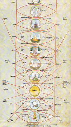 Au dessus des Enfers et de la terre, lénergie cosmique traverse les chakras planétaires et astrologiques en direction du royaume de lExpérience pure, les chakras de lunion et de la félicité. Ecole de Kangra, XVIIIe siecle, gouache sur papier